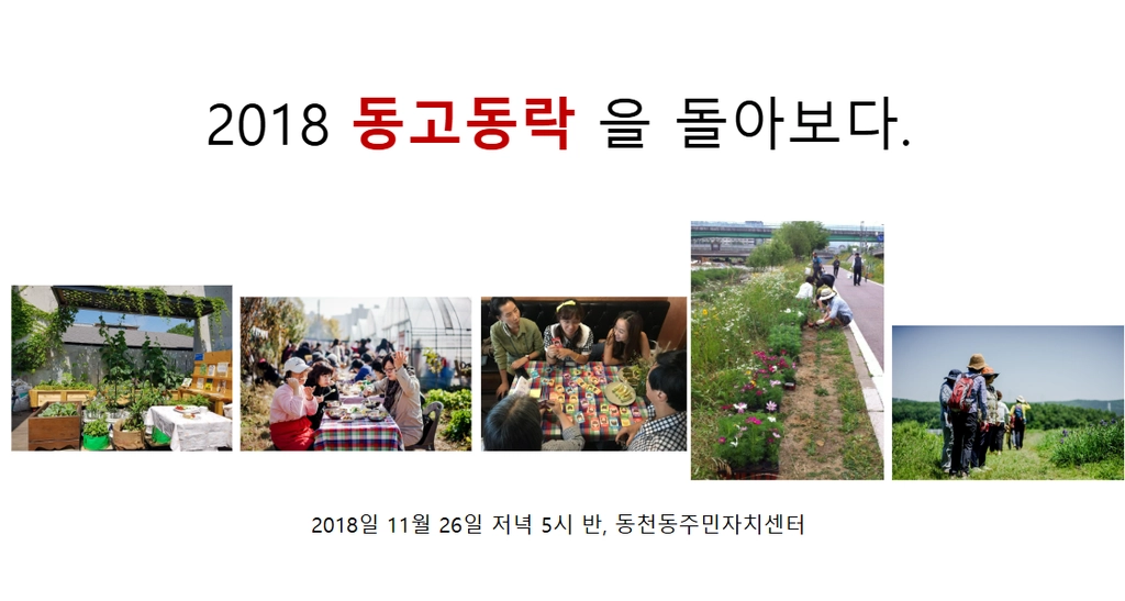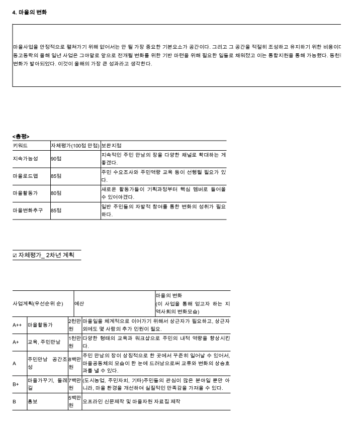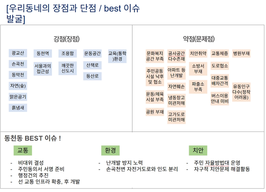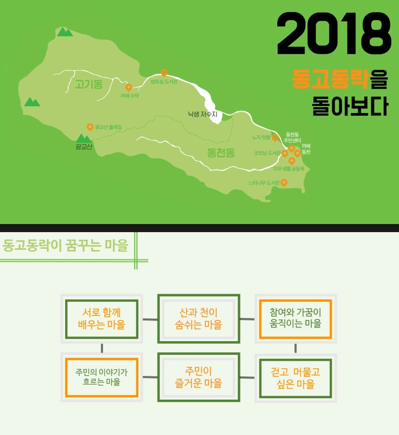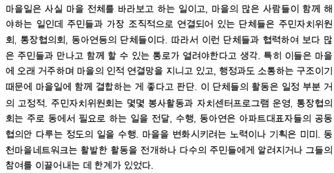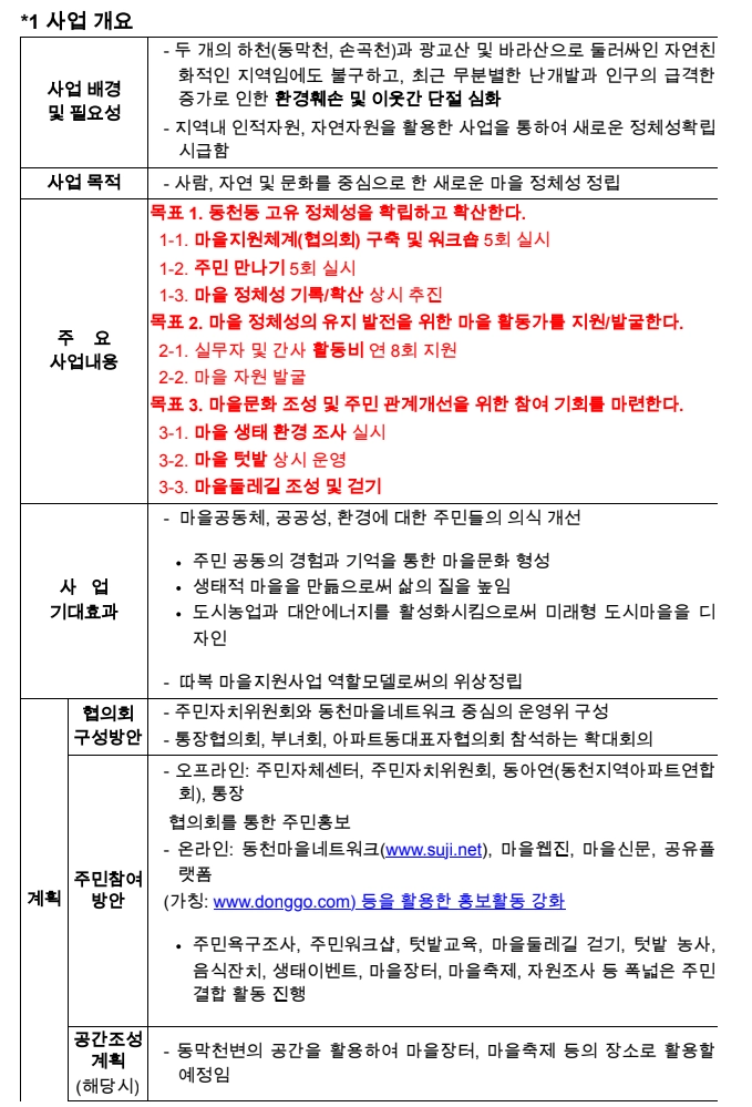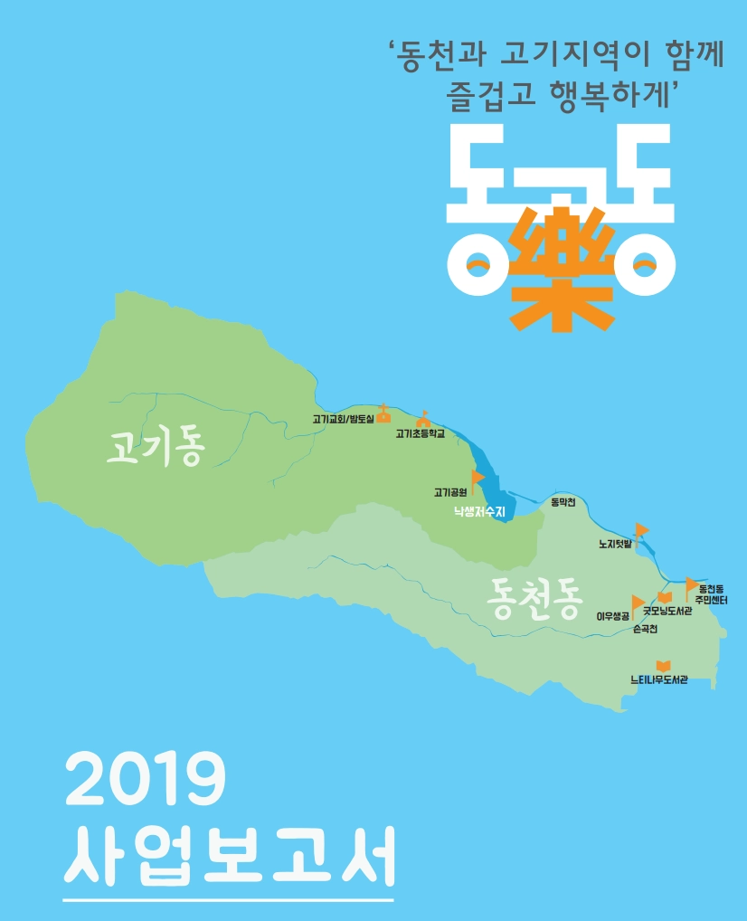 마을활동의 확장을 위해 동천마을네트워크 구성원이 주민자치위원회에 들어가 기존 직능단체들과의 연결을 꾀하게 되고, 이를 발판으로 경기도에서 새롭게 기획한 마을종합지원사업에 도전하게 됩니다. 마을 전체를 바라보며 시도하는 분야별 활동의 전개를 사업계획서, 홍보물, 워크숍 기록, 성과자료집, 자체평가서, 보도자료 등으로 살펴봅니다.