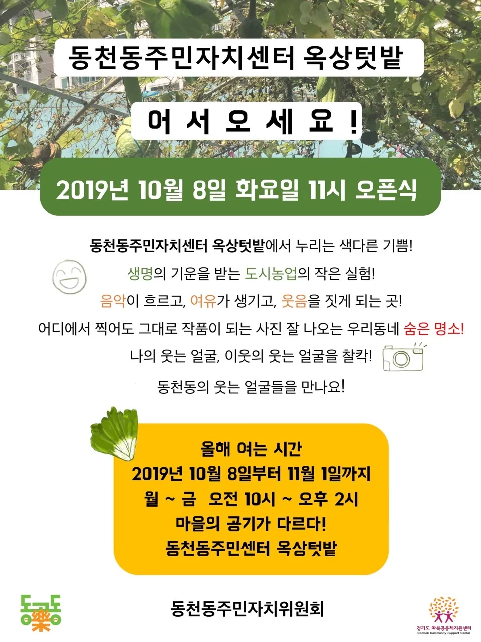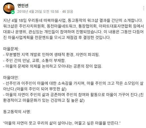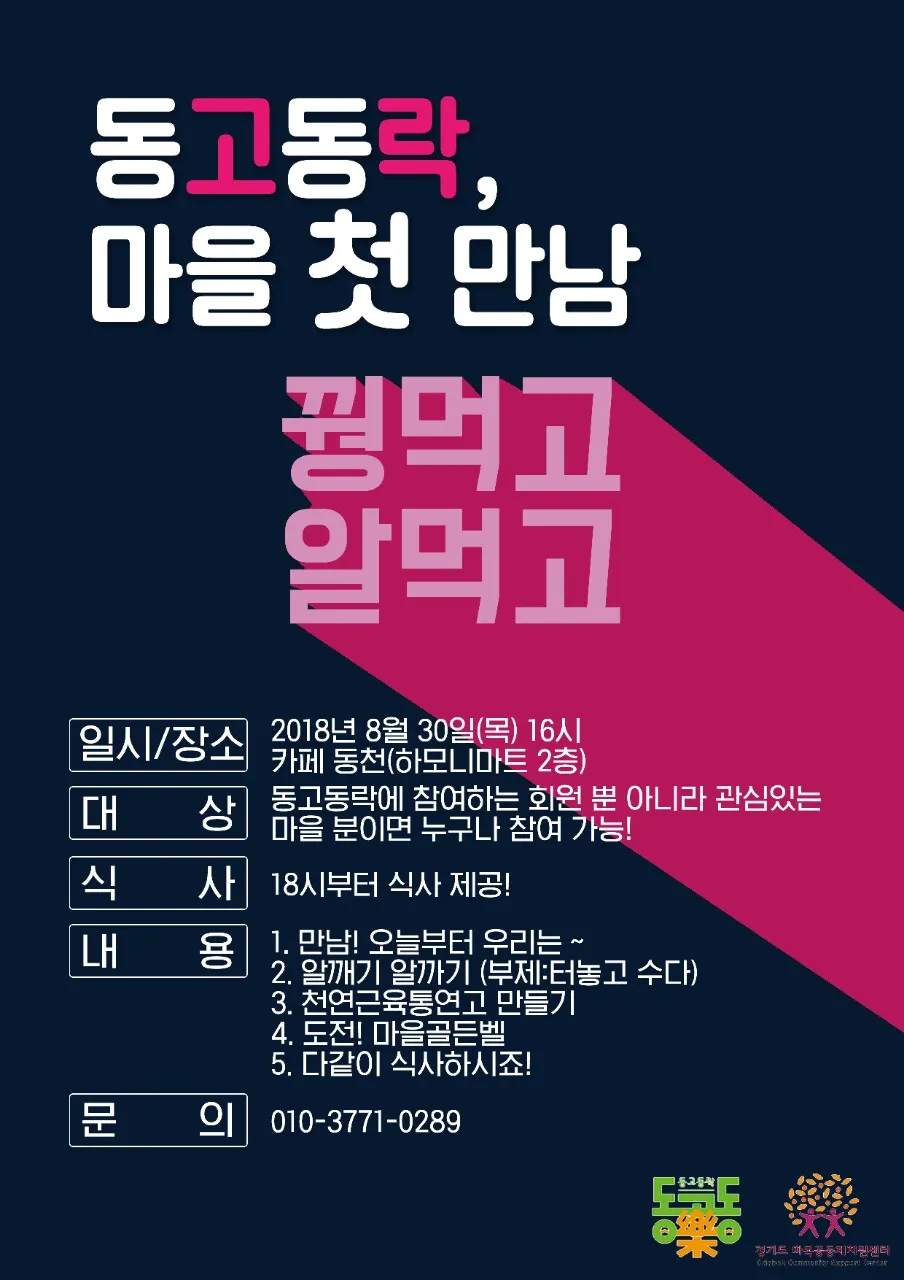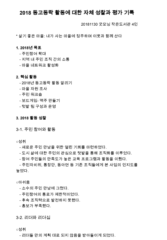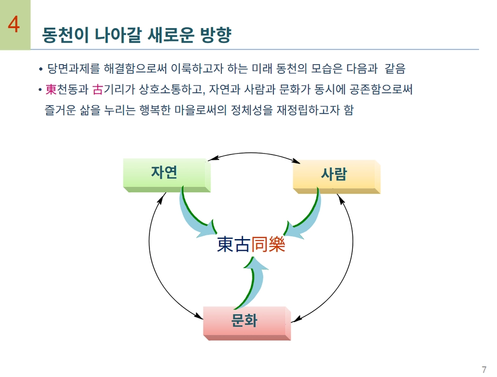 마을활동의 확장을 위해 동천마을네트워크 구성원이 주민자치위원회에 들어가 기존 직능단체들과의 연결을 꾀하게 되고, 이를 발판으로 경기도에서 새롭게 기획한 마을종합지원사업에 도전하게 됩니다. 마을 전체를 바라보며 시도하는 분야별 활동의 전개를 사업계획서, 홍보물, 워크숍 기록, 성과자료집, 자체평가서, 보도자료 등으로 살펴봅니다.