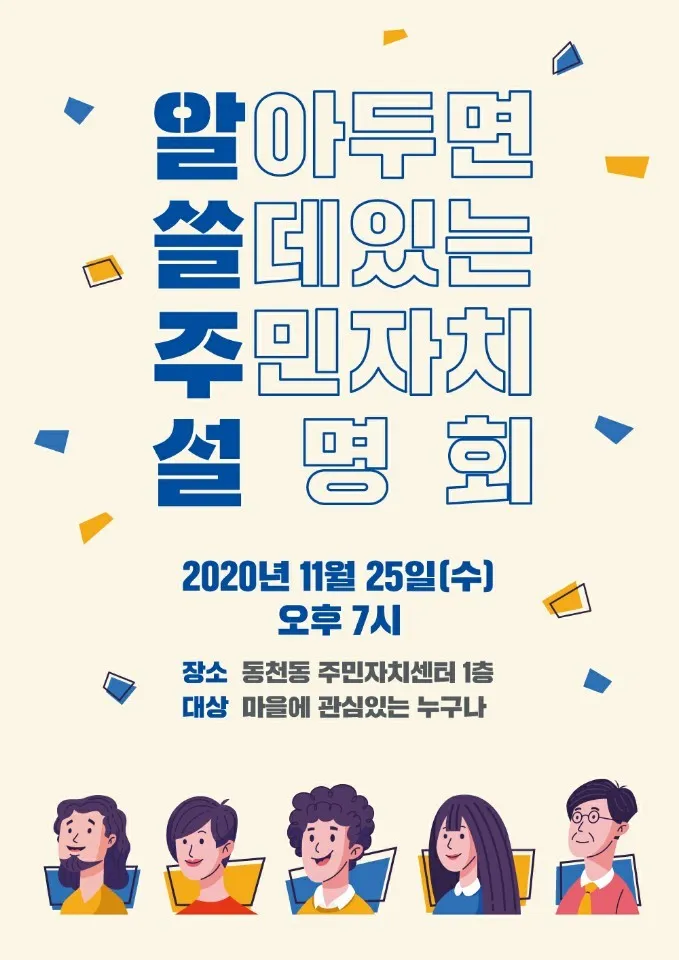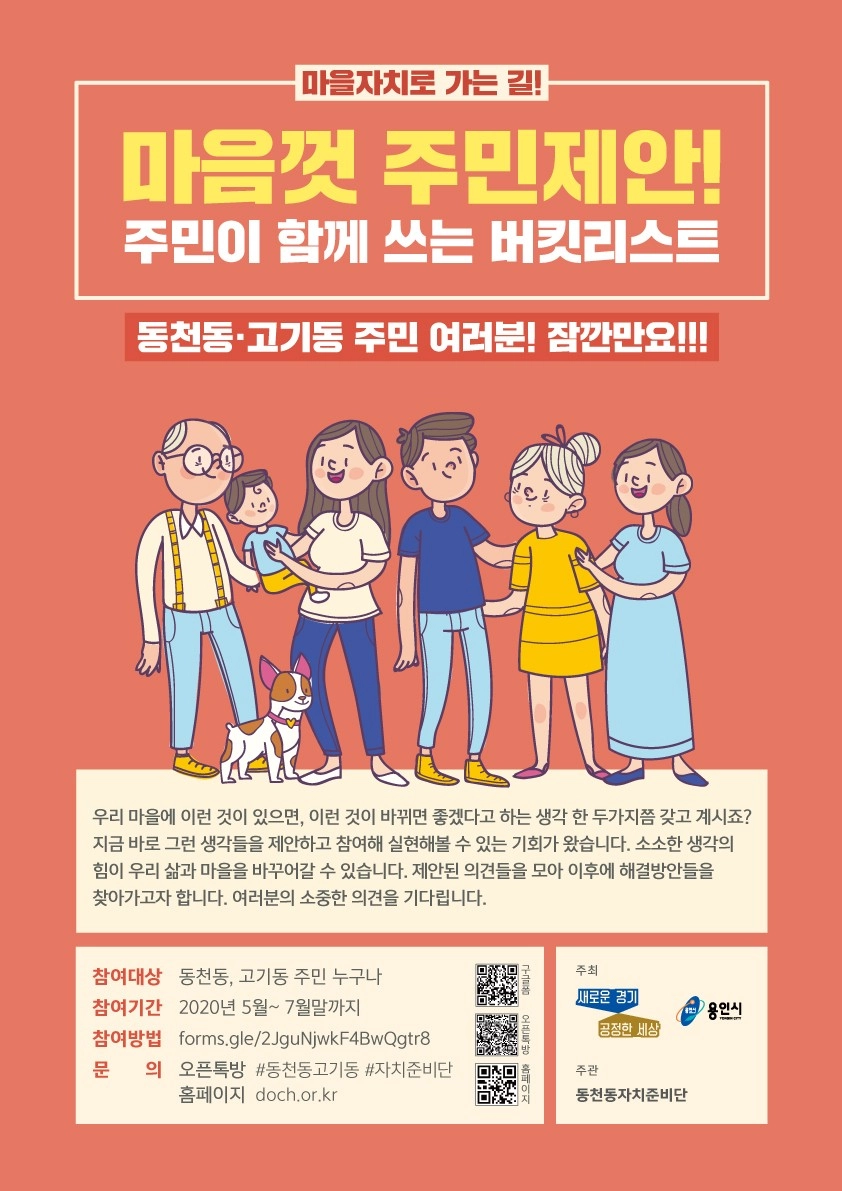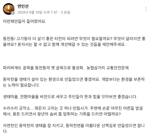 마을작업장. 텃밭상자도 만들고, 업사이클링도 하고, 친환경제품도 만들어보는 공간이 있으면 다양한 물건을 만들어보고 싶습니다. 옛이야기 해주는 아줌마 힐링 컨셉의 1박2일 동천동에서 묵어보기 프로그램 을 마을사업으로 마을곳곳에서 일어나는 공연 및 낭독 축제 마을길 점령 문화 게릴라 행사 마을 유튜브 만들기 청년부터 노년까지 열린 대학 마을자치학교 모델 연극 공연, 팟캐스트, 유투브, 마을방송 고기동 주민들의 마을장터나 작은음악회 등 주민들이 모여서 친목을 다지는 행사가 있으면 좋겠어요. 삼호DSD 쫒아새고 도시개발아파트사업 출발을 못하게 해야합니다.~~^^ 옛날 우물을 제데로 만들면 좋을 듯 ~~~