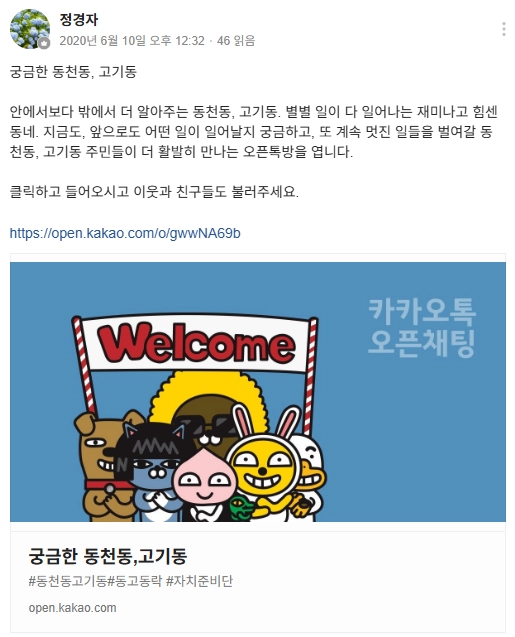 마을주민들이 서로서로 필요한 정보를 주고 받을 수 있을 뿐만 아니라 더 많은 주민이 이를 통해 마을에 대해 알아가고 뭐라도 함께 할 수 있도록 오픈채팅방을 개설해 알림방으로 소통방으로 활용하였습니다.