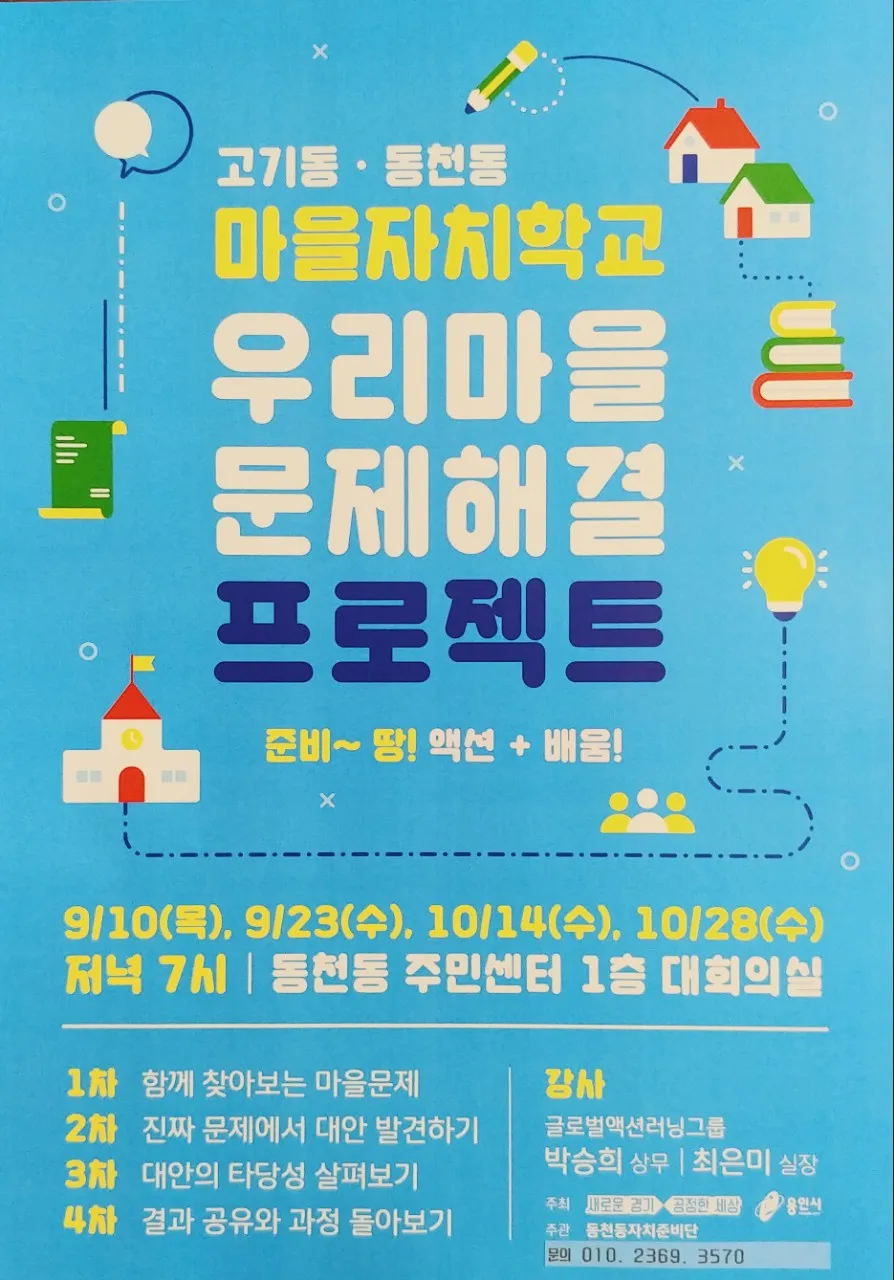 본격적으로 마을그룹별로 문제를 찾아 액션러닝 기법을 활용해 그 문제의 해결책을 찾는 실질적인 성과와 결과물을 유도하는 4차에 걸친 마을자치학교 프로젝트를 홍보하는 웹자보입니다.