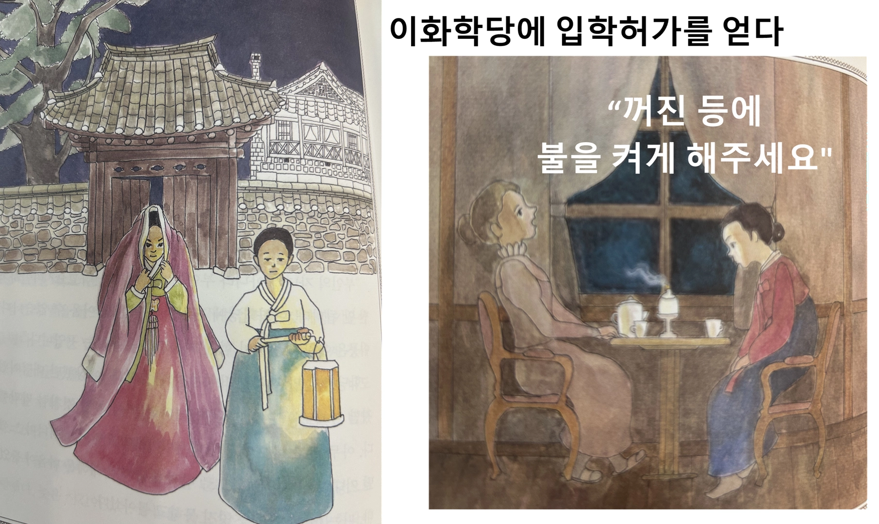 그렇게 이화학당장을 찾아간 김란사는 혼인한 사람은 학교에 입학할 수 없다는 교칙 때문에 여러 번 거절을 당합니다. 마지막으로 용기를 내어 학당장을 찾아간 김란사는 등불을 갑자기 꺼버리고는 이야기합니다.