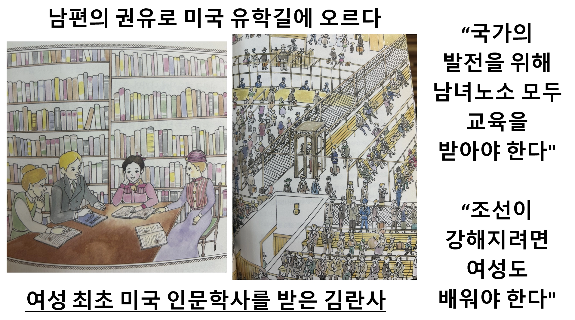 일본 유학과 우리나라 여성 최초로 미국 유학을 다녀온 김란사는 그것을 자신의 이익을 위해서가 아닌 일제 시대 고통 받는 조선 사람들과 나라의 발전을 돕는 데 기여했습니다. 아이들이 언젠가 자신의 삶을 위한 길을 가겠지만, 때로는 김란사처럼 다른 사람을 도와주는 삶의 길도 생각해보라고 말해주고 싶습니다.