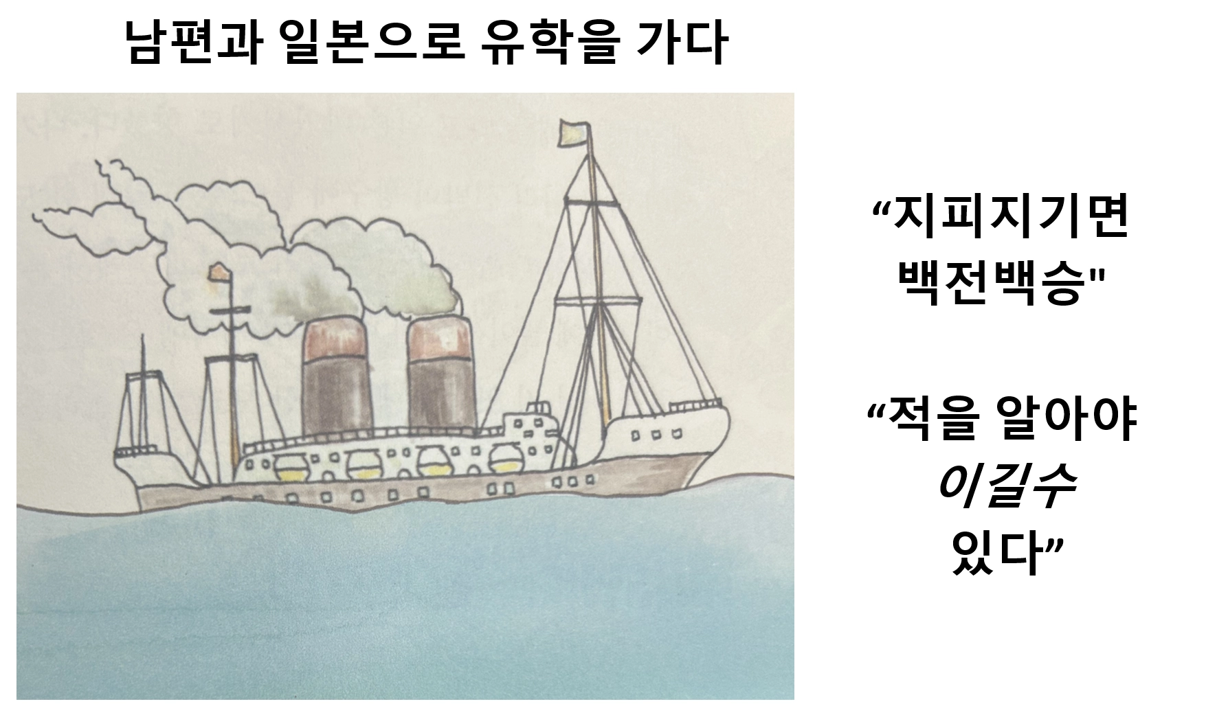그녀는 일 년 동안 이화 학당에서 공부한 뒤에도 남편과 함께 일본 유학길에 오릅니다. 지피지기면 백전백승. 조선을 삼키기 위해 호시탐탐 기회를 노리던 일본을 몰아내기 위해서입니다.